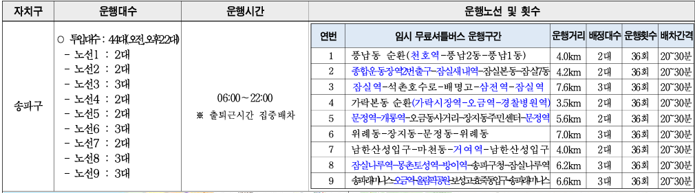 - 정규 버스 파업이 종료되면 무료셔틀 운행도 중단되니 송파구청 공지를 수시로 확인하세요